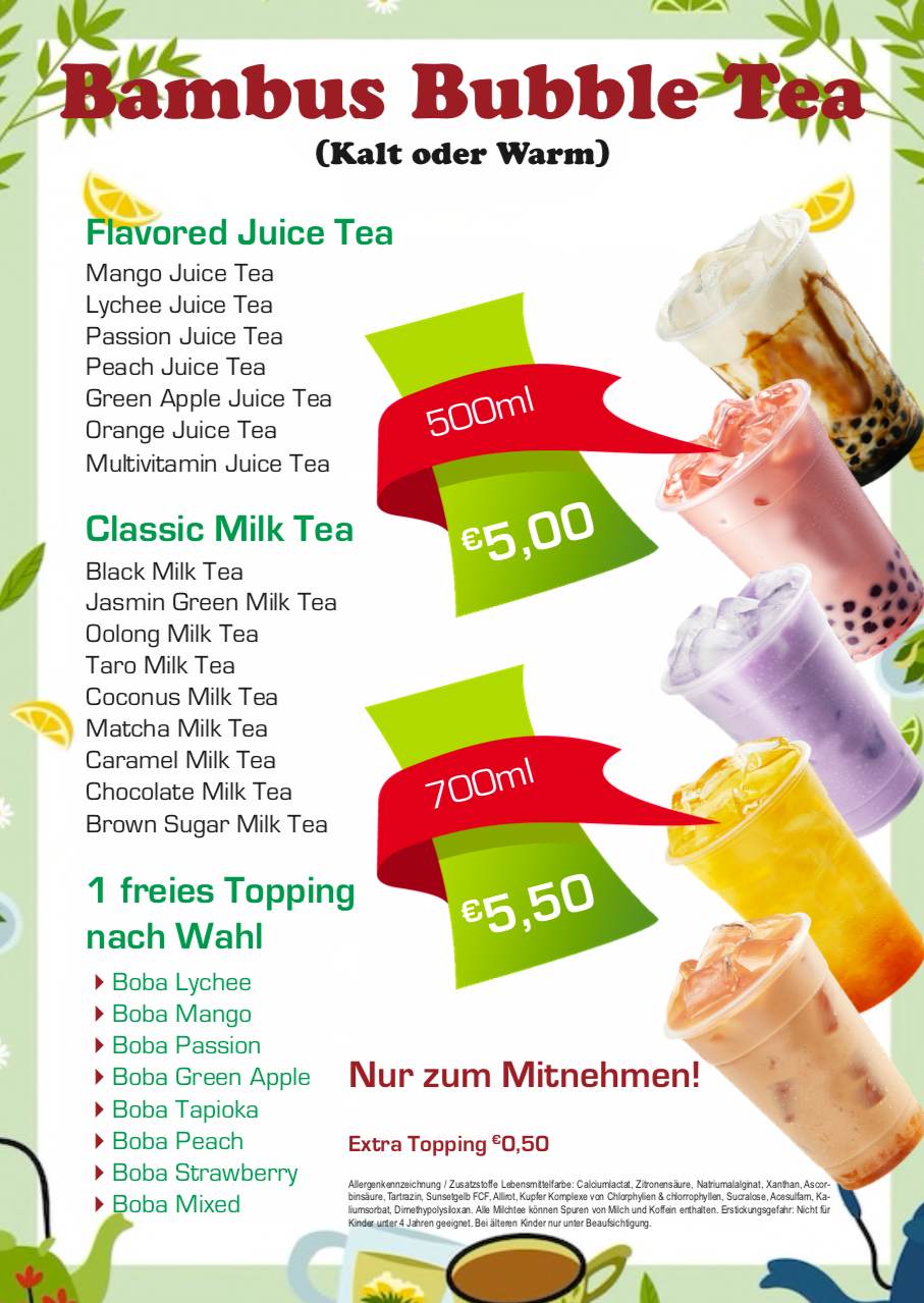 Bei uns kommen Sie in den Genuss von asiatischer Küche begleitet von Duftreis. Suppen und Salate dürfen natürlich auch nicht fehlen. Als Vorspeise sehr zu empfehlen sind auch unsere Frühlingsrollen aus dem täglich von unserem Koch frisch aus der Pfanne gebackenem Teig.